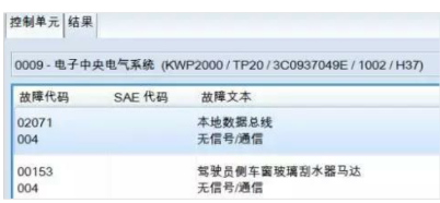 檢查分析:關(guān)閉發(fā)動(dòng)機(jī)蓋,接通點(diǎn)火開關(guān),操作雨刷器開關(guān),發(fā)現(xiàn)兩側(cè)雨刷沒有任何反映。接下來使用車輛診斷儀VAS6150C檢測(cè)車輛中所有控制單元的故障,發(fā)現(xiàn)09電子中央電器系統(tǒng)存在2個(gè)故障碼,02071含義為:本地?cái)?shù)據(jù)總線無信號(hào)/通信、00153含義為:駕駛員側(cè)車窗玻璃刮水器馬達(dá)無信號(hào)/通信,如圖1所示。