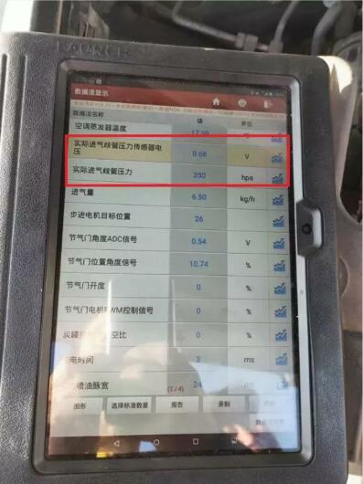 于是用解碼器讀取數(shù)據(jù)流,發(fā)現(xiàn)進(jìn)氣壓力傳感器的電壓是0.68V,進(jìn)氣壓力傳感器為250Hpa。