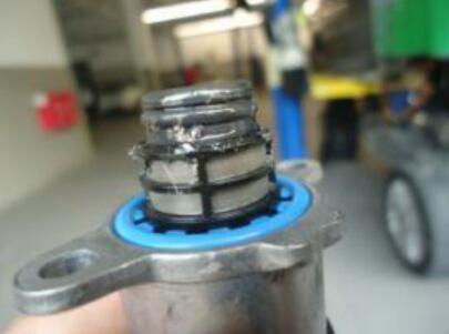 4、 通過拆解檢查發(fā)現(xiàn)燃油泵計量閥的濾網(wǎng)處有很多高壓燃油泵磨出來的鐵銷,最終判定是高壓燃油泵損壞,需要更換高壓燃油泵、高壓油軌、6個噴油嘴。