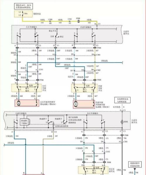 供電電路:當點火開關處于ACC 、RUN位置時或當附件延時RAP繼電器啟用時,電壓通過保險絲盒內30A保險絲L1-L2 供電給左前車窗開關的C1-B端。