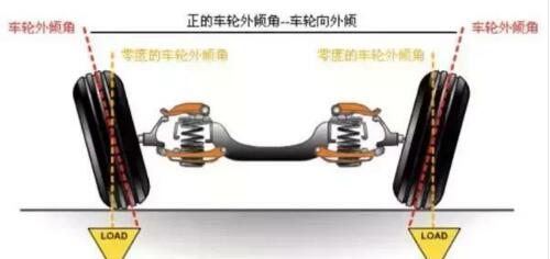 之前的老款或載重汽車上,由于重載時(shí)的下壓力,設(shè)計(jì)師會(huì)把車輪外傾設(shè)計(jì)正正值(防止重載時(shí)輪胎過(guò)分內(nèi)傾),而現(xiàn)代汽車都有助力轉(zhuǎn)向系統(tǒng),并且為了提高車輛高速及轉(zhuǎn)向時(shí)的穩(wěn)定性,設(shè)計(jì)師會(huì)把車輪外傾角設(shè)計(jì)成接近于零或負(fù)值(圖6)。