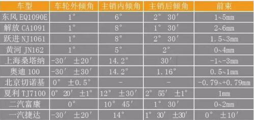 表1 部分載重汽車和轎車的車輪定位數(shù)據(jù)