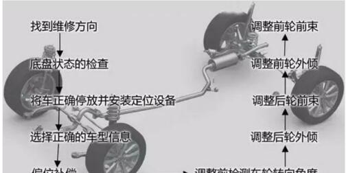 在轎車四輪定位數(shù)據(jù)修正與調(diào)整中,以主銷后傾角、車輪外傾角和車輪前束為主要調(diào)整對(duì)象,在大多數(shù)情況下,一般只需調(diào)整前輪前束。如果有必要調(diào)整其他定位參數(shù),則應(yīng)遵循圖12所示的四輪定位調(diào)整順序。