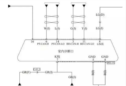為了確定CAN H 或CAN L 導(dǎo)線是否損壞或信號是否正常,可以測量其對地電壓(平均電壓)。測量點通常在OBD診斷接口處,如下圖所示。