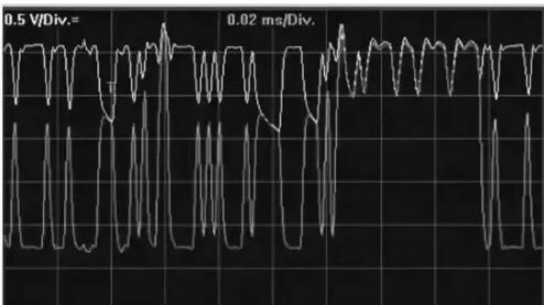 如果出現(xiàn)故障的控制模塊帶有終端電阻,可以用電阻測量法來判斷。測量診斷接口的CAN H 與CAN L 之間的電阻,若變?yōu)?20Ω,則說明有一個終端電阻斷路。如果出現(xiàn)故障的控制模塊不帶終端電阻,那么需要測量該控制模塊的CAN導(dǎo)線的導(dǎo)通性。CAN L 斷路的總線波形如下圖所示。