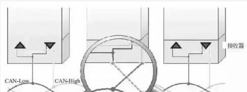 當出現(xiàn)CAN L 與CAN H 導(dǎo)線互相接反這種故障時,一般情況下,接錯的那個控制模塊將無法通信,其他控制模塊的通信則正常。CAN L 與CAN H 導(dǎo)線互相接反的示意圖如下圖所示。