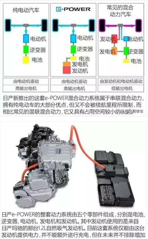汽油車要加油,純電動車要充電這似乎是孩子們都知道的常識,日產(chǎn)的工程師有意打破慣性思維。他們將自家最新研發(fā)成果命名為e-POWER,這是一套由汽油發(fā)動機與電機結(jié)合的動力總成。很多朋友可能會說既有發(fā)動機,又有電機,那就應(yīng)該是混動而非純電動。要給它下定義,我們首先得知道純電動和混動車型是怎么工作的。
