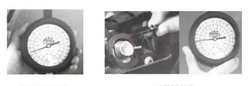 主要原因是可燃混合氣過濃或過稀造成混合氣在氣缸內(nèi)無法正常燃燒,下圖(a)所示為怠速時(shí)的壓力表指示值。