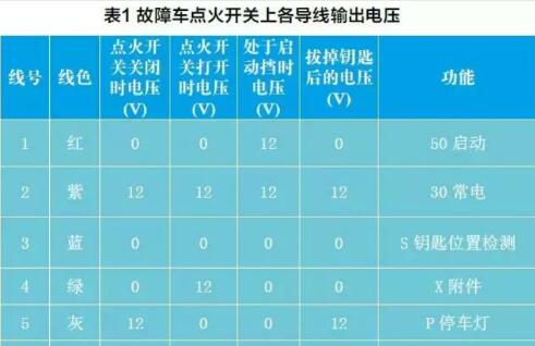 查閱故障車(chē)點(diǎn)火開(kāi)關(guān)相關(guān)電路圖,用萬(wàn)用表檢測(cè)點(diǎn)火開(kāi)關(guān)上6根導(dǎo)線的輸出電壓如表1所示。