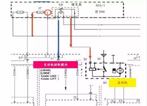 根據(jù)電路圖(如圖5所示),在前SAM內(nèi)M位置,找到啟動機(jī)繼電器,測量30號的電源,發(fā)現(xiàn)無電源,給87號腳供電,啟動機(jī)轉(zhuǎn)動,說明啟動機(jī)及電路正常。檢查30號電源的上游保險(xiǎn)f7,發(fā)現(xiàn)保險(xiǎn)虛接。