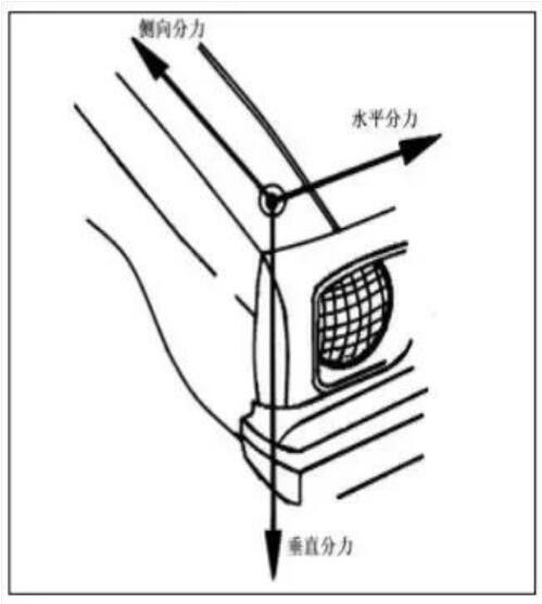 同樣的碰撞力,板件的棱角和邊緣剛性不同時(shí),碰撞后的 損傷情況也不同。當(dāng)剛性較小時(shí),棱角和邊緣損傷跡象雖比較明 顯,但當(dāng)能量通過附近的結(jié)構(gòu)逐漸消散時(shí)其損傷跡象反而很小。反之,棱角和邊緣損傷跡象雖很小,但當(dāng)能量傳遞至車身內(nèi)部很 深的部位產(chǎn)生比較嚴(yán)重的內(nèi)部損傷。