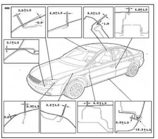 如圖6所示,車門、翼子板、發(fā)動(dòng)機(jī)罩、行李箱蓋等之間的 配合間隙都有一定的要求,通過觀察、對比或測量它們之間間隙 的變化可以判定哪些發(fā)生了變形。對比左右翼子板與發(fā)動(dòng)機(jī)罩的 間隙情況,可通過簡單地開關(guān)車門及觀察門的準(zhǔn)直來確定車身立 柱是否受到損傷。