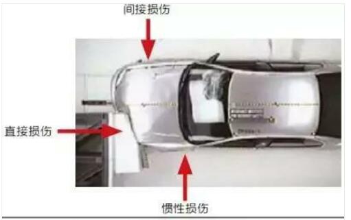 當(dāng)汽車受到碰撞時(shí),質(zhì)量大的部件(如發(fā)動(dòng)機(jī))的慣性會使其 向相反方向移動(dòng)而發(fā)生沖擊,產(chǎn)生慣性損傷,故需對固定件、周 圍部件及板件進(jìn)行檢查,當(dāng)然精確的損傷評估還要靠精確的車身 三維測量來確定。