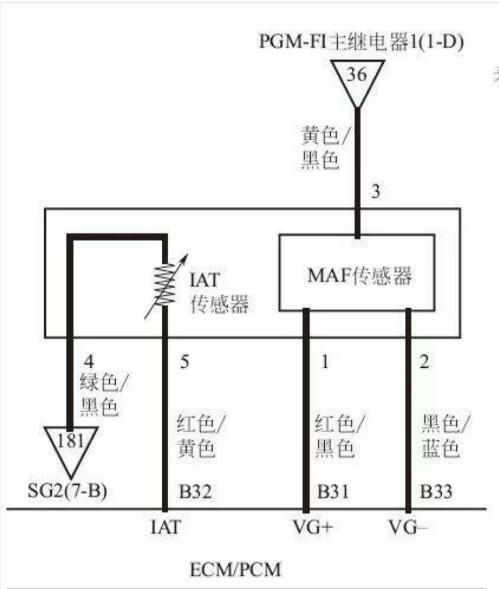 本田雅閣車系空氣流量計(jì)電路連接如下圖所示。傳感器3#端子來自主繼電器的12V工作電源,傳感器1#端子、2#端子為傳感器信號(hào)輸出端,5#端子為進(jìn)氣溫度傳感器信號(hào)輸出端。