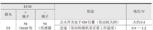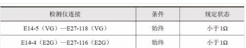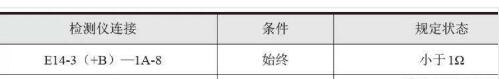 關(guān)閉點(diǎn)火開關(guān),斷開空氣流量傳感器插頭,再從發(fā)動(dòng)機(jī)室繼電器盒和接線盒總成上拆下1號(hào)集成繼電器,用萬用表測(cè)量1號(hào)繼電器1A插頭8#端子和傳感器插頭E14的3#端子電阻應(yīng)小于1Ω。再用萬用表千歐擋檢測(cè)傳感器插頭E14的3#端子或1號(hào)繼電器插頭1A的8#端子與車身接地之間的電阻,應(yīng)為10kΩ或更大。如下表所示。
