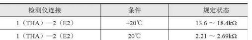 檢查內(nèi)置于空氣流量傳感器中的進(jìn)氣溫度傳感器電阻。插頭E14的1#端子為進(jìn)氣溫度傳感器信號(hào)輸出端,2#端子為接地端,如下圖所示,檢查結(jié)果如下表所示。如果結(jié)果不符合規(guī)定,則更換質(zhì)量空氣流量計(jì)分總成。