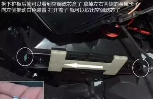 第三,空調(diào)濾芯盒兩側(cè),會有兩個白色的金屬卡子,拿下來之后,向左側(cè)推動盒子中間的H型裝置,取出濾芯