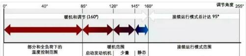 通過兩個旋轉閥的轉動角度實現(xiàn)不同流量的冷卻液在汽缸 蓋、汽缸體、機油冷卻器、渦輪增壓器、變速器的冷卻器與主冷 卻器(散熱器)之間流動,使得發(fā)動機工作溫度保持在86~107℃的 范圍之內。該系統(tǒng)有三個基本控制范圍(圖5):