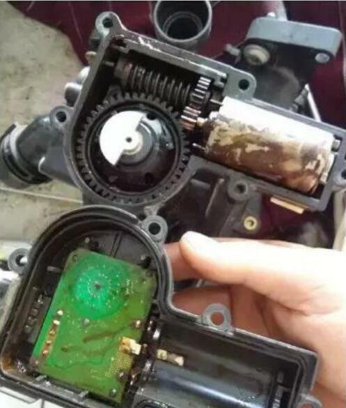 測量節(jié)氣門插頭T6/2 的供電電壓為 1.8V,正常應為5V 左右,說明供電電壓 過低,依次拔下電路圖中涉及的傳感器 插頭,并再次測量節(jié)氣門處供電電壓,當 拔下發(fā)動機溫度調節(jié)執(zhí)行元件N493 時, 節(jié)氣門端子T6/2 的電壓變?yōu)榱?.01V, 參考電壓恢復正常!此時啟動發(fā)動機,運行平穩(wěn), 因此說明是溫度調節(jié)執(zhí)行元 件N493 出現(xiàn)了問題。分解執(zhí)行元件 N493( 圖3),發(fā)現(xiàn)其內部滲入了冷卻液, 元件已被腐蝕。