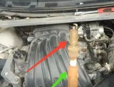師傅分析發(fā)動(dòng)機(jī)失火最可能的原因是火花塞或點(diǎn)火線圈有問(wèn)題,師傅決定先檢查火花塞。沒(méi)想到的是,師傅看到拆下來(lái)的點(diǎn)火線圈和火花塞后,真是驚呆了!如下圖綠色箭頭所示,黑色的點(diǎn)火線圈已經(jīng)變成褐色;紅色箭頭所示的火花塞,也已經(jīng)變成了褐色!