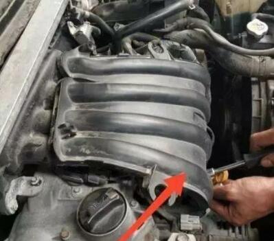 下圖箭頭所示,師傅正在拆卸發(fā)動(dòng)機(jī)上部的進(jìn)氣歧管,它擋著另外三個(gè)點(diǎn)火線圈,必須先把它給拆下才行,這就比百分之九十的發(fā)動(dòng)機(jī)麻煩。