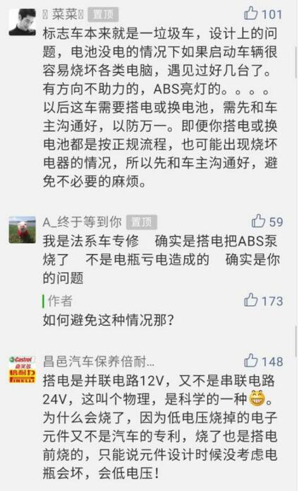 @A寧德藝嘉達(dá)車行18605936,標(biāo)致本身故障就多,電瓶搭電還會把ABS燒了,以后誰還幫你施救?無賴的車主,搭電完應(yīng)該要檢查儀表還有沒有其它燈亮,需和客戶溝通,事后溝通都是耍賴了,當(dāng)場說明原因比事后說好的多