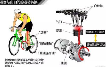 這個運動原理其實跟我們踩自行車非常相似,我們兩個腳相當于相鄰的兩個活塞,腳踏板相當于連桿軸,而中間的大飛輪就是曲軸的主軸。我們左腳向下用力蹬時(活塞做功或吸氣向下做運動),右腳會被提上來(另一活塞壓縮或排氣做向上運動)。這樣周而復始,就有直線運動轉(zhuǎn)化為旋轉(zhuǎn)運動了。