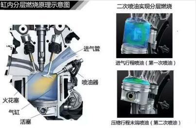 在活塞壓縮行程末端時再進行第二次噴油,這樣在火花塞附近形成混合氣相對濃度較高的區(qū)域(利用活塞頂?shù)奶厥饨Y(jié)構(gòu)),然后利用這部分較濃的混合氣引燃汽缸內(nèi)的稀薄混合氣,從而實現(xiàn)氣缸內(nèi)的稀薄燃燒,這樣可以用更少的燃油達到同樣的燃燒效果,進一步降低發(fā)動機的油耗。