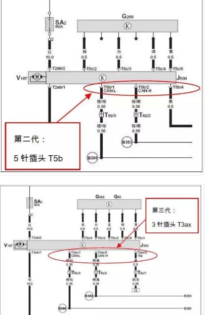 另,自2008 年10 月起,途安方向機由第二代切換到第三代,兩者主要區(qū)別為第三代方向機轉(zhuǎn)向角度傳感器G85 是安裝在方向機上的,原5 針插頭T5b 替換為3 針插頭T3ax,見下圖。