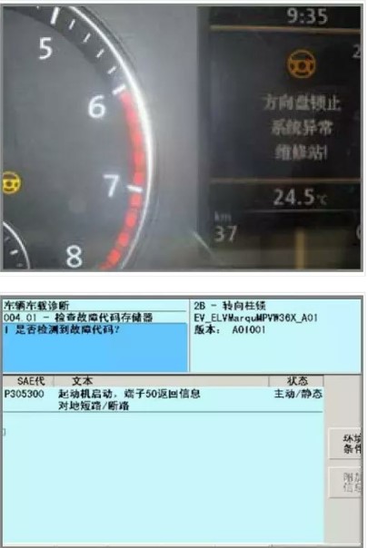 儀表中轉(zhuǎn)向黃燈報警。2B 控制單元中有故障碼:P30530 起動機啟動,端子50 返回信息對地短路/斷路 主動/靜態(tài)。