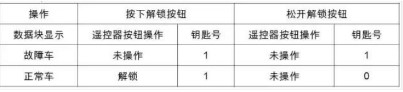 對遙控進(jìn)行同步(先按遙控鑰匙上的解鎖按鈕,然后在一分鐘內(nèi)用鑰匙頭將汽車解鎖),無效。讀取 BCM 數(shù)據(jù)塊檢查控制器是否收到遙控器信號,發(fā)現(xiàn)按下遙控鑰匙時,“ 遙控器按鈕操作” 顯示“ 未操作” ,鑰匙號顯示為“ 1” ,松開鑰匙后保持為“ 1” ,不正常。