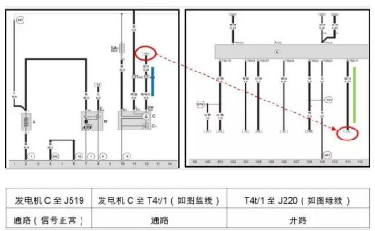 4、查閱電路圖,測量發(fā)電機到發(fā)動機控制單元之間的信號線,電阻無窮大,線束斷路。(見下圖)