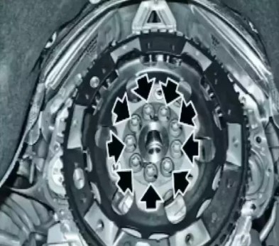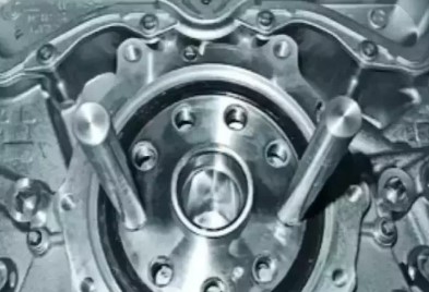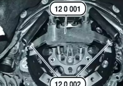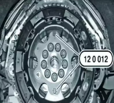 (3)將導(dǎo)向銷上的電機(jī) 小心地向后導(dǎo)入取下專用工具 12 0 001( 安裝輔助工具)和專用工具 12 0 002(旋動)。裝入新的曲軸螺栓。