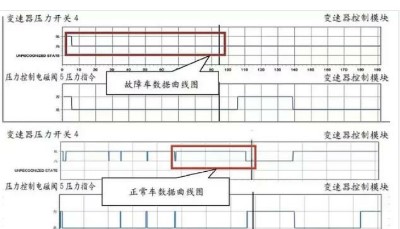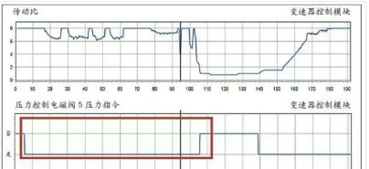 查看油壓開關(guān)4的工作狀態(tài),為一條直線(如圖4所示中方框),沒有壓力過來,也就是有可能是壓力控制電磁閥5過來的油壓沒有,或是1234擋控制閥卡滯在關(guān)閉位置,所以油壓開關(guān)4壓力一直為高,沒變化。