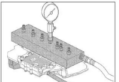 用螺栓將DT-48616 測試板安裝至控制電磁閥(帶閥體和變速器控制模塊)總成的閥體安裝表面,如圖6所示。壓縮氣體被送入鋁制測試盒,通過控制電磁閥(帶閥體和變速器控制模塊)總成電磁閥通道,返回測試盒上的一個壓力表中。如果空氣壓力通過電磁閥,壓力表指示打開;若空氣無法通過電磁閥,則指示關(guān)閉。使用故障診斷儀指令電磁閥通電或斷電。觀察壓力表時,可以確定閥的功能是否正常。