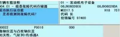 起動發(fā)動機,發(fā)現(xiàn)發(fā)動機起動時間增加,起動后抖動,組合儀表上的發(fā)動機故障燈報警,故障與客戶描述一致。接下來使用車輛診斷儀VAS5051B檢查網(wǎng)關安裝列表的故障,發(fā)現(xiàn)發(fā)動機電子設備存在故障,如圖1所示。檢查發(fā)動機電子設備的故障碼及含義,發(fā)現(xiàn)存在1個故障00022,含義為:曲軸位置與凸輪軸位置相關性,氣缸列1,傳感器A(靜態(tài)),如圖2所示。根據(jù)該故障碼的含義,結合以往維修該車型發(fā)動機的經(jīng)驗,初步分析造成該故障的原因可能是發(fā)動機正時不正確、發(fā)動機轉速傳感器G28或凸輪軸位置傳感器G40信號錯誤等等。