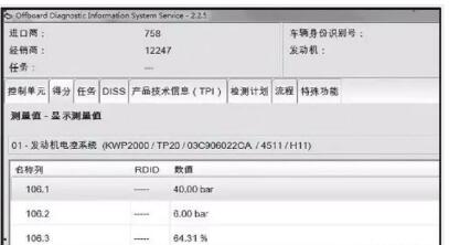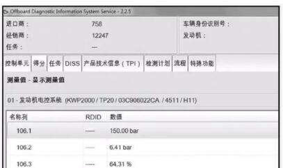 2 連接VAS6150B,在“01—發(fā)動機電控系統(tǒng)”中讀取106組燃油系統(tǒng)壓力值,發(fā)動機怠速和3000r/min時,106.2區(qū)測試結果分別是6.00bar和6.41bar,如下圖所示。