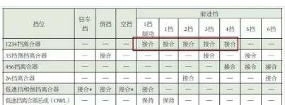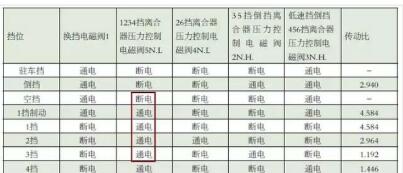 接著查閱各執(zhí)行元件的工作邏輯表,1~4擋的正常工作的主要離合器執(zhí)行元件是(1234擋離合器)(如表2紅色方框部分)。