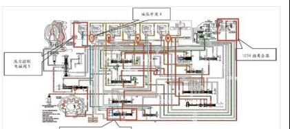 最后查看油路圖(如圖2所示),圖中的紅圈處是壓力開關(guān)(圖中有幾個油壓開關(guān)排列順序是4、3、1、5)。