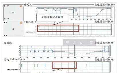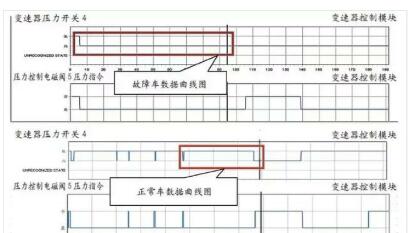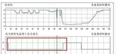 查看油壓開關(guān)4的工作狀態(tài),為一條直線(如圖4所示中方框),沒有壓力過來,也就是有可能是壓力控制電磁閥5過來的油壓沒有,或是1234擋控制閥卡滯在關(guān)閉位置,所以油壓開關(guān)4壓力一直為高,沒變化。