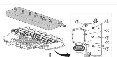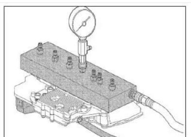 用螺栓將DT-48616 測試板安裝至控制電磁閥(帶閥體和變速器控制模塊)總成的閥體安裝表面,如圖6所示。壓縮氣體被送入鋁制測試盒,通過控制電磁閥(帶閥體和變速器控制模塊)總成電磁閥通道,返回測試盒上的一個壓力表中。如果空氣壓力通過電磁閥,壓力表指示打開;若空氣無法通過電磁閥,則指示關(guān)閉。使用故障診斷儀指令電磁閥通電或斷電。觀察壓力表時(shí),可以確定閥的功能是否正常。