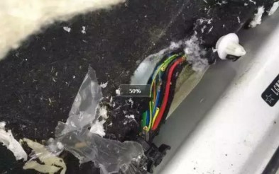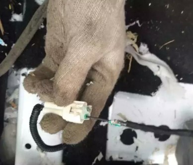 駕駛側(cè)門邊的線也斷了,扶手箱下面的的低頻天線,負(fù)責(zé)無鑰匙啟動的也被咬斷了一根線。