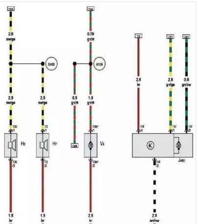 H2. 高音喇叭 H7. 低音喇叭 J400. 刮水器電機控制單元 T2.2 芯插頭連接 T2c.2 芯插頭連接 T2er.2 芯插頭連接 T4i.4 芯插頭連接 V5. 車窗玻璃清洗泵 A156 . 連接(53c),在儀表板導(dǎo)線束中 B430 . 連接(喇叭),在主導(dǎo)線束中