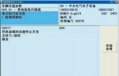 由電路圖可以看出,全新桑塔納的雨刮器和老款的桑塔納控制方法不同,該車雨刮器電機由BCM控制,可以診斷相應(yīng)故障碼,連接故障診斷儀,讀取故障如圖2 所示。
