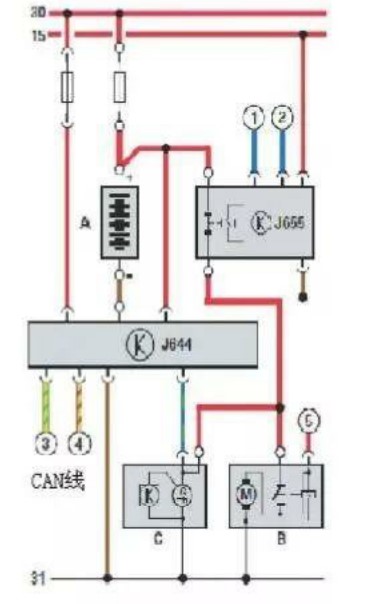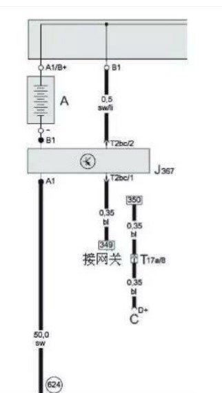 右圖為2009 款 A6L蓄電池監(jiān)控控制單元電路