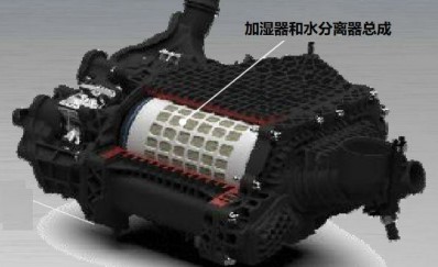 此外,奔馳GLC F-CELL為提升燃料電池系統(tǒng)功率密度,對(duì)相關(guān)零部件進(jìn)行了高度集成開(kāi)發(fā),比如對(duì)進(jìn)氣端板集成化,即將水氣進(jìn)出歧管和氫氣再循環(huán)分配板高度總成;集成多個(gè)空氣部件,如加濕器和水氣分離器集成等。