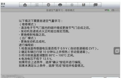 3.此時務(wù)必仔細(xì)閱讀匹配的前提條件,此外還需踩下制動踏板,通過掛入D/R檔位使怠速降至800r/min左右后,再點擊【確認(rèn)】按鈕。