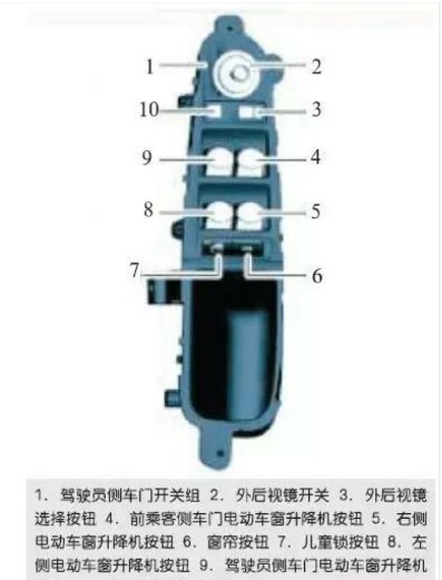 后窗玻璃窗簾按鈕位于駕駛員側車門開關組內(如圖11所示)。