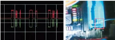 檢查K-CAN2,使用雙通道示波器在CDM的CAN-H與CAN-L測量的波形,如圖8所示中左側,同時測量JBE到CDM的K-CAN2的線路的通斷,如圖8所示中右側,正常。
