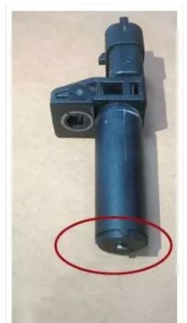 拆下檢查曲軸位置傳感器(B70)發(fā)現(xiàn)曲軸位置傳感器頭部吸了一個小鐵片(如圖2所示),懷疑可能是裝配時其他部件上的金屬屑脫落,被B70內(nèi)部的磁鐵吸引,吸附在傳感器外部,直接影響到傳感器的信號質(zhì)量;去除吸附的小鐵片,檢查外觀沒有任何碰撞破損或進(jìn)水痕跡,插針完好;重新安裝B70,試車,結(jié)果幾千米以后故障再次出現(xiàn)。
